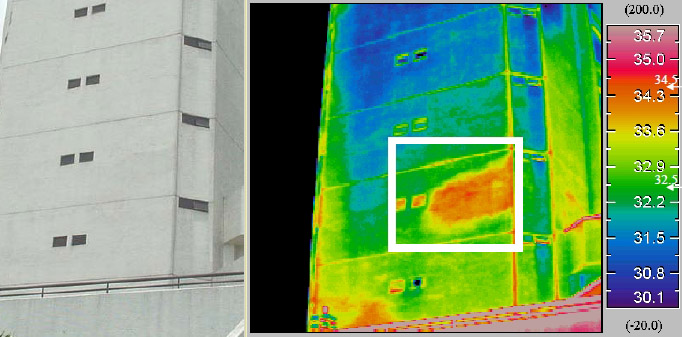 在混凝土建筑物的施工及使用過程中,往往會(huì)形成一些缺陷和損傷,造成這些缺陷和損傷的原因是多種多樣的,如:因施工原因?qū)е碌幕炷两Y(jié)構(gòu)內(nèi)部空洞、不密實(shí)區(qū)、蜂窩及保護(hù)層不足、鋼筋外露等;因溫差、不均勻變形等產(chǎn)生的溫度裂縫、變形裂縫等;因腐蝕介質(zhì)或凍融作用產(chǎn)生的由表及里的層狀疏松以及一些受力裂縫等。這些缺陷和損傷往往會(huì)嚴(yán)重影響建筑物的承載能力和耐久性。紅外熱像儀可以方便地檢測(cè)建(構(gòu))筑物的上述質(zhì)量缺陷。相對(duì)于建(構(gòu))筑物某一構(gòu)件或某一區(qū)域,正常情況時(shí),整個(gè)構(gòu)件表層發(fā)生的紅外熱輻射應(yīng)是均勻一致,反映在紅外熱成像上,相應(yīng)區(qū)域的顏色是單一均勻的,不存在明顯的顏色差異,也就是說,不存在明顯的色彩異常區(qū);當(dāng)非正常時(shí),如構(gòu)件存在有空洞、不密實(shí)區(qū)、蜂窩等缺陷時(shí),在這些部位,由于直接改變了構(gòu)件表面與內(nèi)部的熱導(dǎo)通性,因此會(huì)存在相對(duì)于正常部位的紅外輻射異常。在這種情況下,紅外熱能圖片上反映的顏色非單一均勻,不同熱輻射條件的構(gòu)件表面對(duì)應(yīng)不同的顏色(色彩異常)。紅外處理熱能圖片上的顏色異常區(qū),通過與可見光數(shù)碼照片的比較判斷,可以直觀明了地看到異常區(qū)在實(shí)際構(gòu)件的位置。